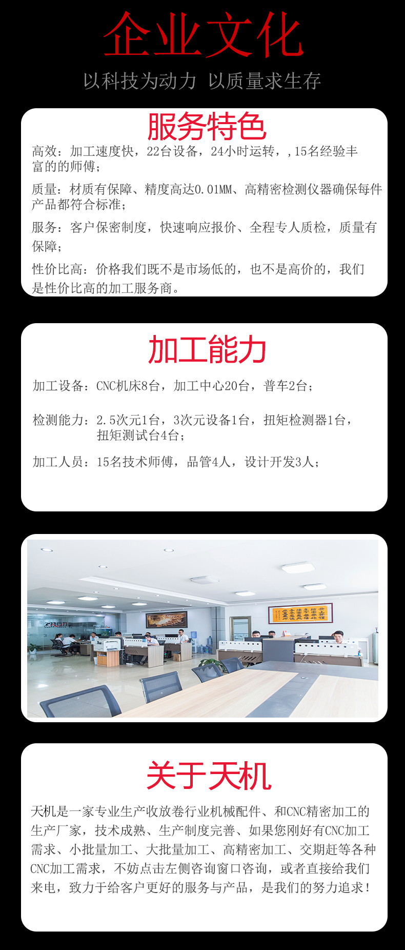 今年因受國內(nèi)大環(huán)境影響,除了在做好原有的核心產(chǎn)品外,另增加生產(chǎn)線,專注于精密零件的制造加工,以“專業(yè)、技術(shù)、服務(wù)、誠信”為企業(yè)導(dǎo)向;堅(jiān)持以人為本,精密高效,持續(xù)創(chuàng)新,客戶至上的品質(zhì)方針,現(xiàn)有各種先進(jìn)的CNC加工設(shè)備及測量設(shè)備,對鋁合金,銅合金,碳素鋼,合金剛,不銹鋼,特種工程塑料等有著豐富的加工經(jīng)驗(yàn), 同時(shí)我們整合了行業(yè)資源,利用壓鑄,粉末冶金,擠型材等成型毛胚料加工,最大限度的降低量產(chǎn)產(chǎn)品成本;并發(fā)展了一批長期合作的表面處理,熱處理,噴涂,無塵清洗等業(yè)內(nèi)合作伙伴,為客戶提供全方位的產(chǎn)品與服務(wù)。